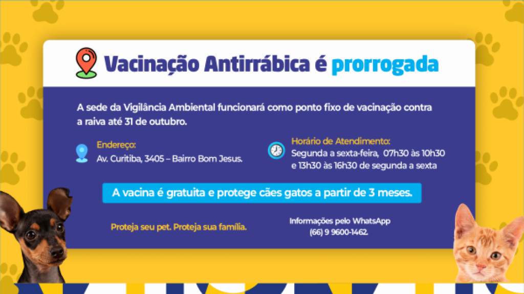 A campanha de vacinação antirrábica em ponto fixo ganhou um novo prazo. Agora, os tutores têm até o dia 31 de outubro para levar seus cães e gatos para receber a dose gratuita contra a raiva. A ação, organizada pela Prefeitura Municipal, por meio da Secretaria de Saúde e da equipe da Vigilância Ambiental, garante o cuidado coletivo com a saúde pública e o bem-estar animal.